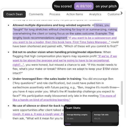 Coach with data, not hunches: Our AI analyzes tone, objections, missed steps. It scores each rep vs your ideal process and shows where they fell short.